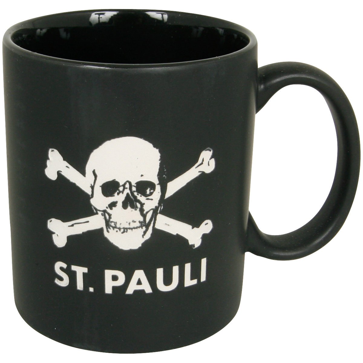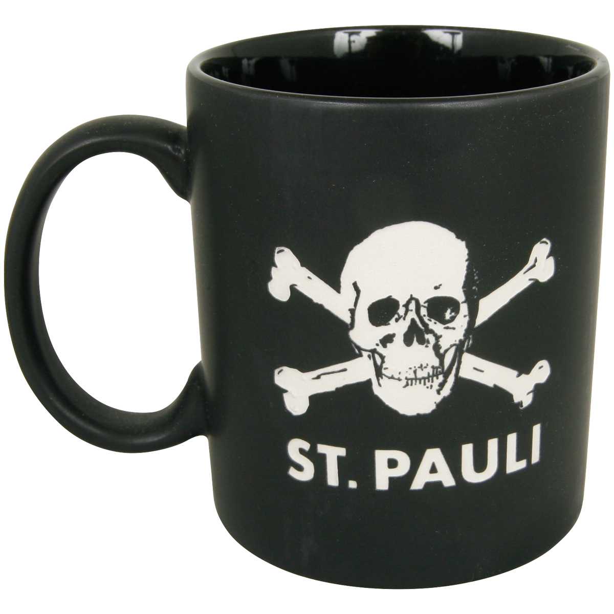 Diese klassische Tasse vom FC St. Pauli kommt in Schwarz, dazu ist vorne der bekannte FCSP Totenkopf mit ST. PAULI Schriftzug in Weiß zu erkennen. Durch das Sandstrahlen des Totenkopfs in den Becher hebt er sich besonders von dem Tiefschwarz des Bechers ab.