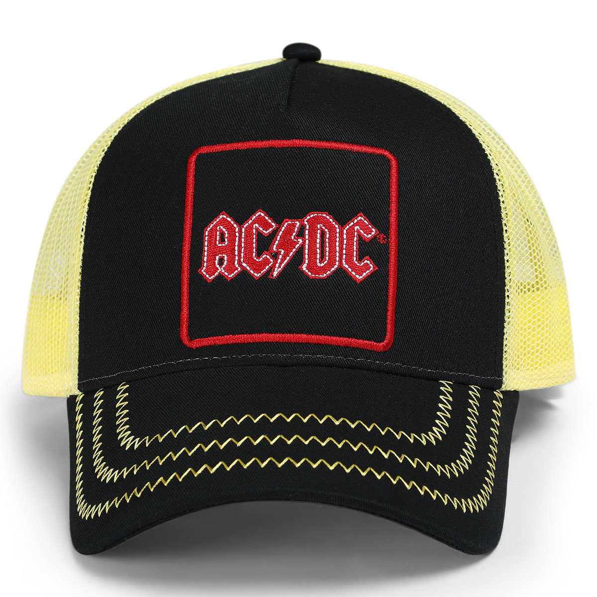 - Schwarz-gelbe Trucker Cap mit rotem AC/DC Logo-Stick vorne