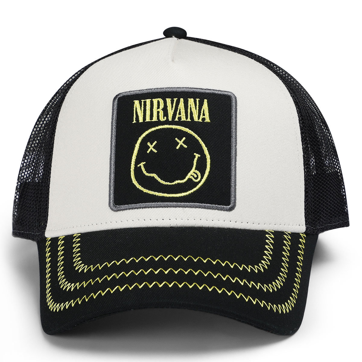 - Trucker Cap in Schwarz & Weiß mit gelbem Nirvana Smiley Logo