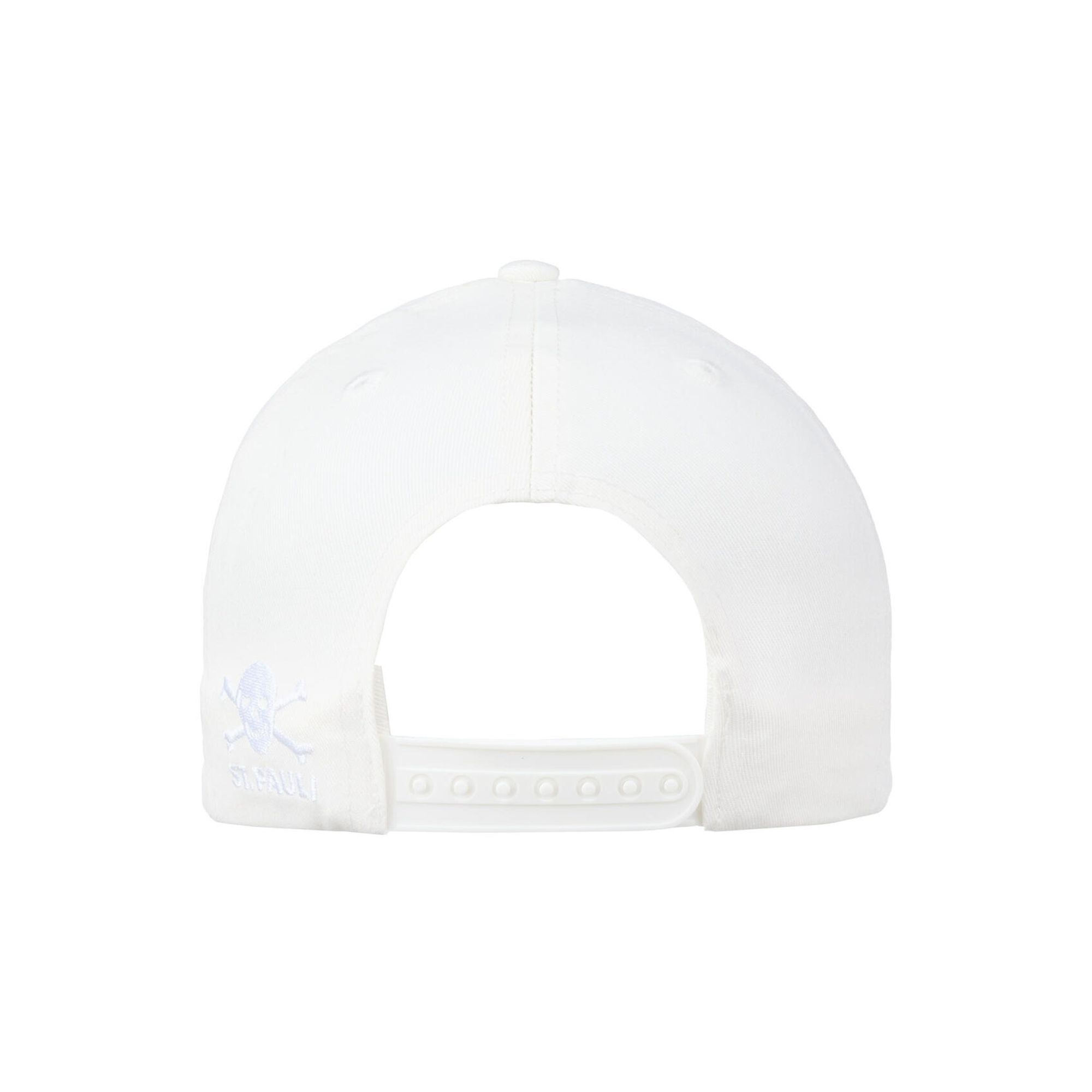 - Weiße Baseball Cap mit tonalem "ST. PAULI" Schriftzug im Varsity-Stil auf der Vorderseite, kleine Totenkopf Stickerei auf der Rückseite