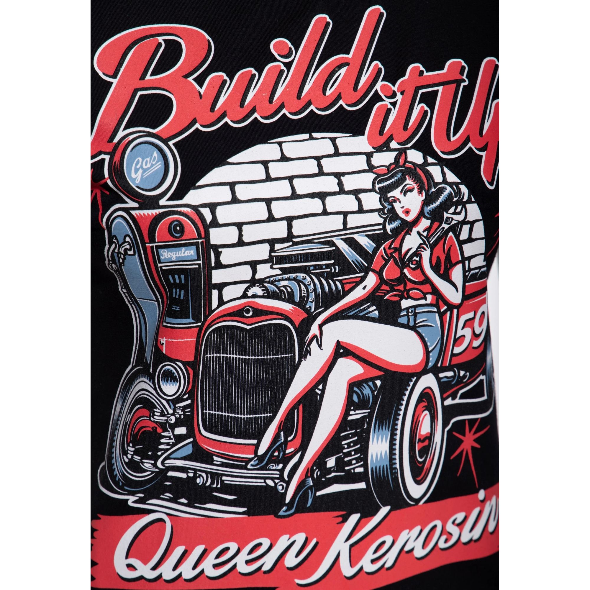 Feminines Queen Kerosin Damen T-Shirt mit großem „Build it up“-Frontprint im 50s-Kustom-Stil (Hotrod & Pin-up). Slim-Fit-Passform mit weichem Baumwoll-Elastan-Mix und klassischem Rundhalsausschnitt.