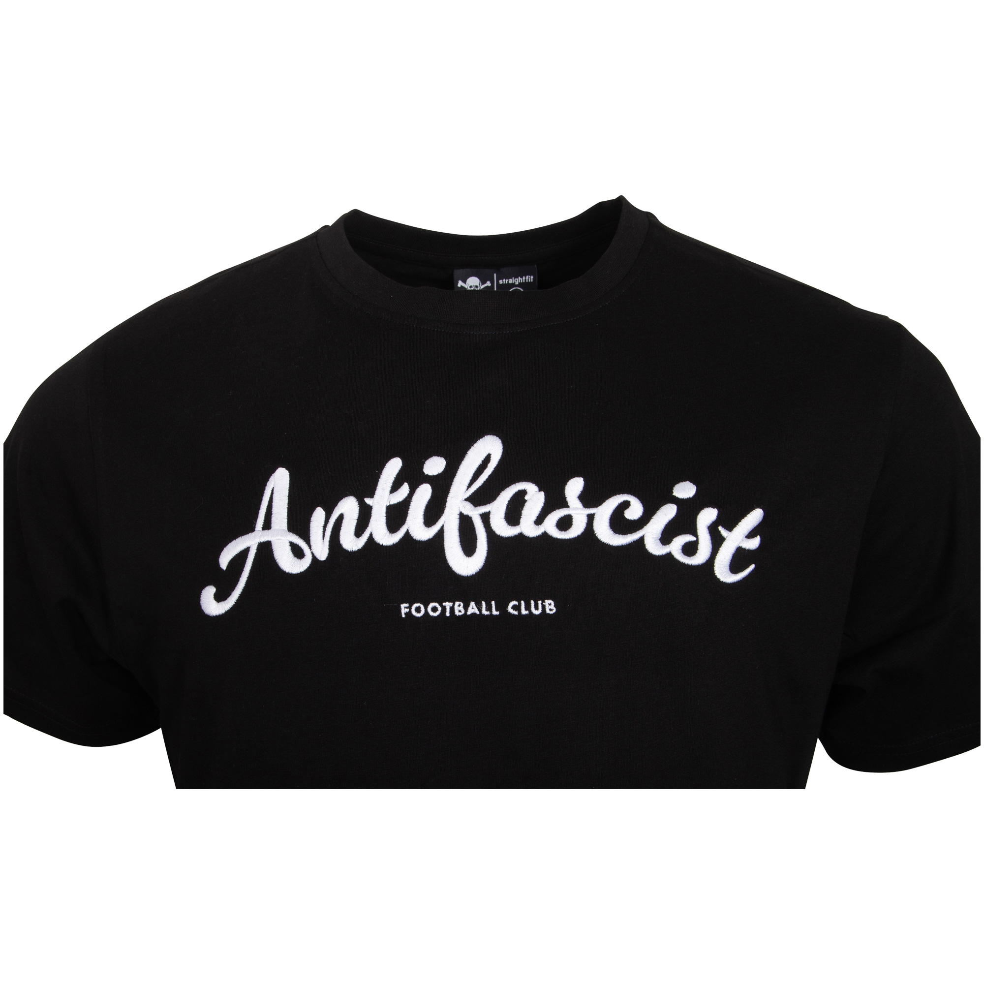 Antifascist Football Club. Wir sind mehr als ein Fußballverein und das ist auch gut so! Das schwarze, aus Bio-Baumwolle bestehende, stylische und bequeme T-Shirt vertritt ein klares Statement mit dem ausgestickten Schriftzug Antifascist Football Club auf der Brust. Ein absolutes Musthave für alle St. Paulianerinnen!