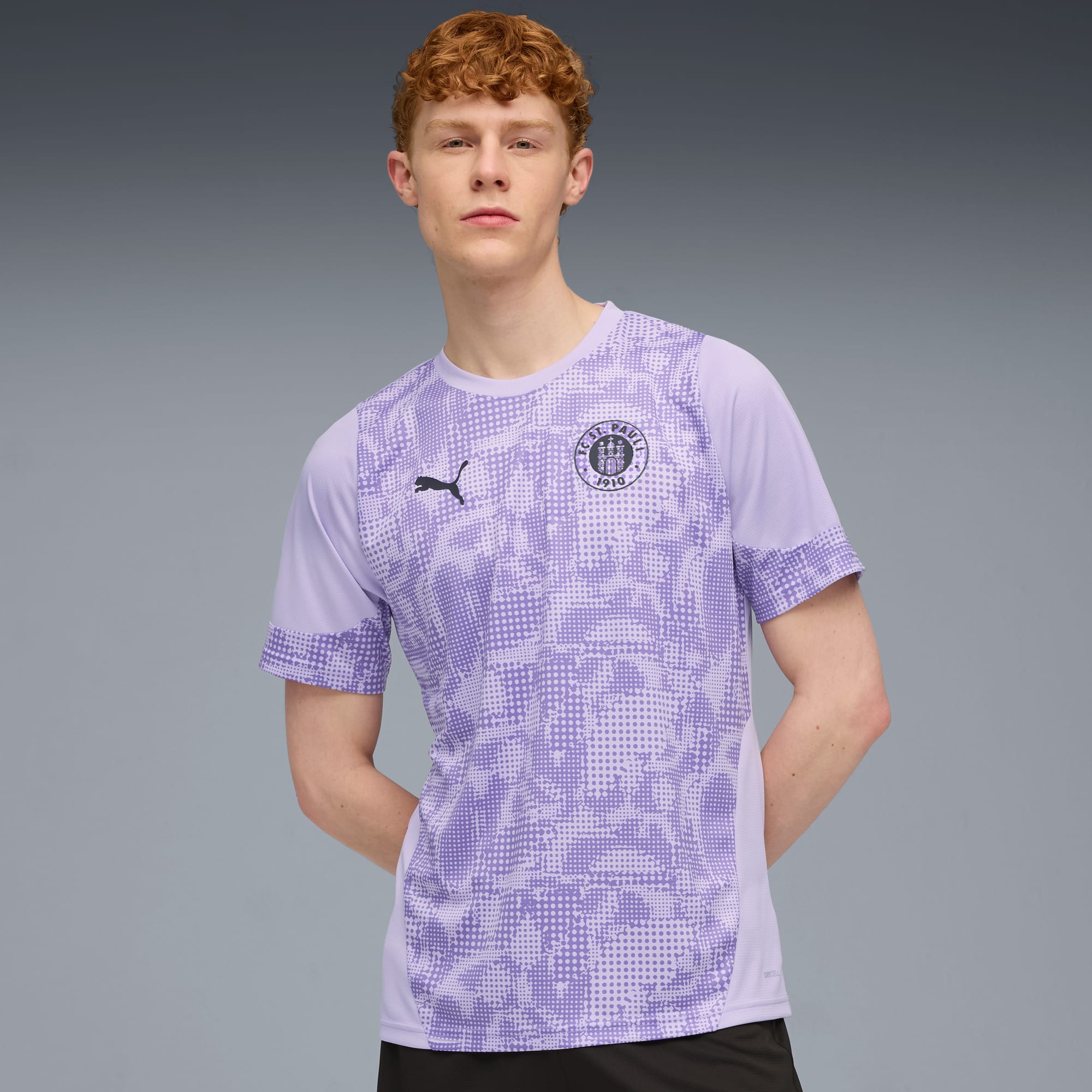 Frisch, auffällig, energiegeladen – mit dem lila Trainingsshirt aus der FC St. Pauli x PUMA Teamwear 2025/26 bringst du Farbe auf den Platz. Das grafische Allover-Muster in verschiedenen Lila-Tönen verleiht dem Shirt einen dynamischen Look, während das Ton-in-Ton-Vereinslogo auf der Brust deine Verbundenheit zu St. Pauli stilvoll unterstreicht.