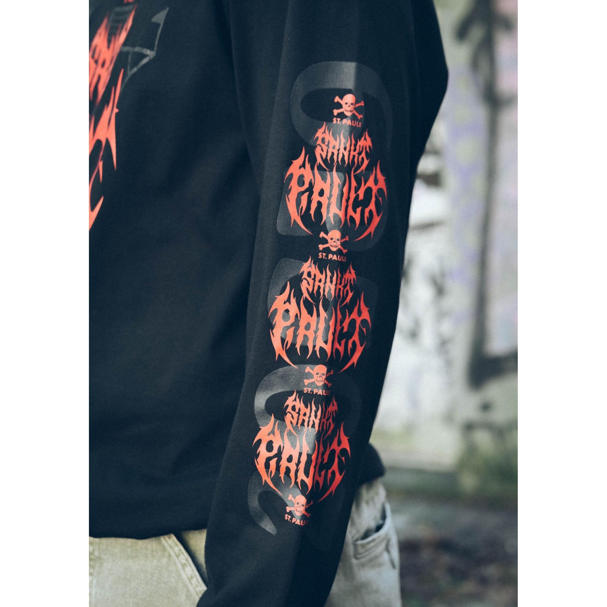 - "SANKT PAULI" im Metal-Flammen-Schriftzug mit Stern- und Fußballtor-Motiv, Totenkopf-Logo und Postleitzahl "20359" auf der Brust; beide Ärmel mit dreifach wiederholtem "SANKT PAULI"-Motiv in Rot und Grau; Rücken einfarbig schwarz